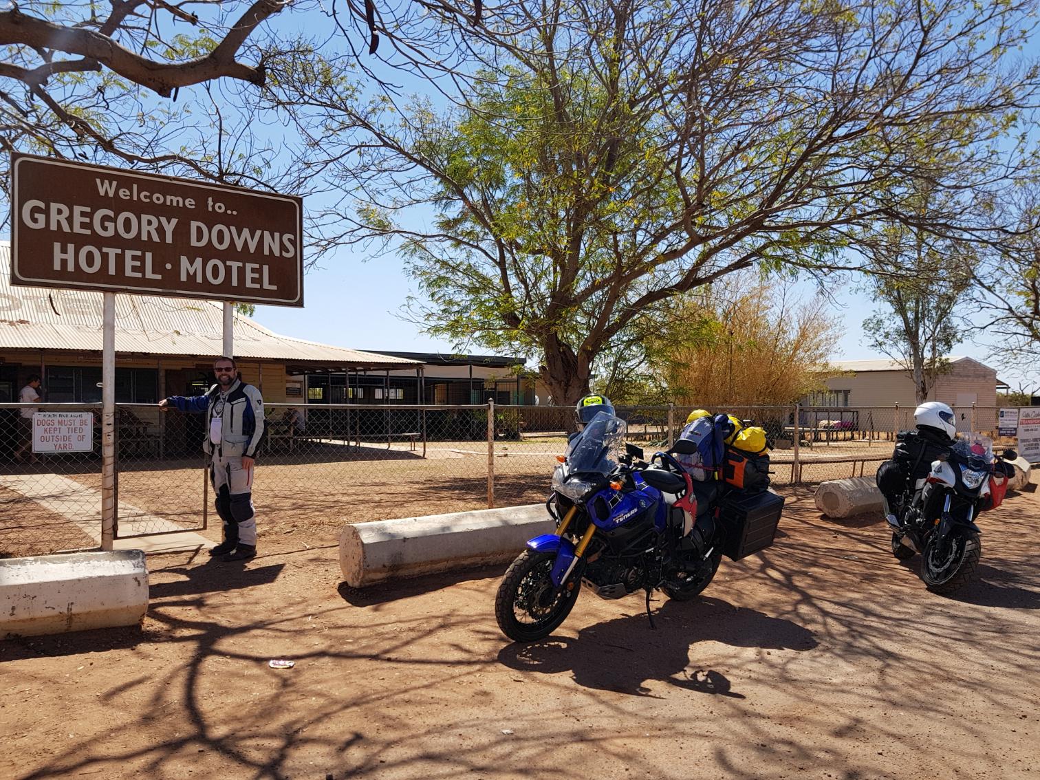 About 20 kays from Gregory, I was really starting to fade, and it was a real relief to see the signs of the little community. They have a couple of houses, the pub, and a quaint little general store. The pub sells fuel, so we fuelled up for the third time today. Got to take it when you can. We had a couple of cold drinks in the bar, and discovered there is a free camp down by the river, which is really nice, or we could camp here at the pub. So we went for a look at both. The river, free camp, was packed with caravans, and did not look good for us, so we paid $20 and pitched our tent under the trees out the back of the pub, with toilets and a shower, and peace and quiet.
