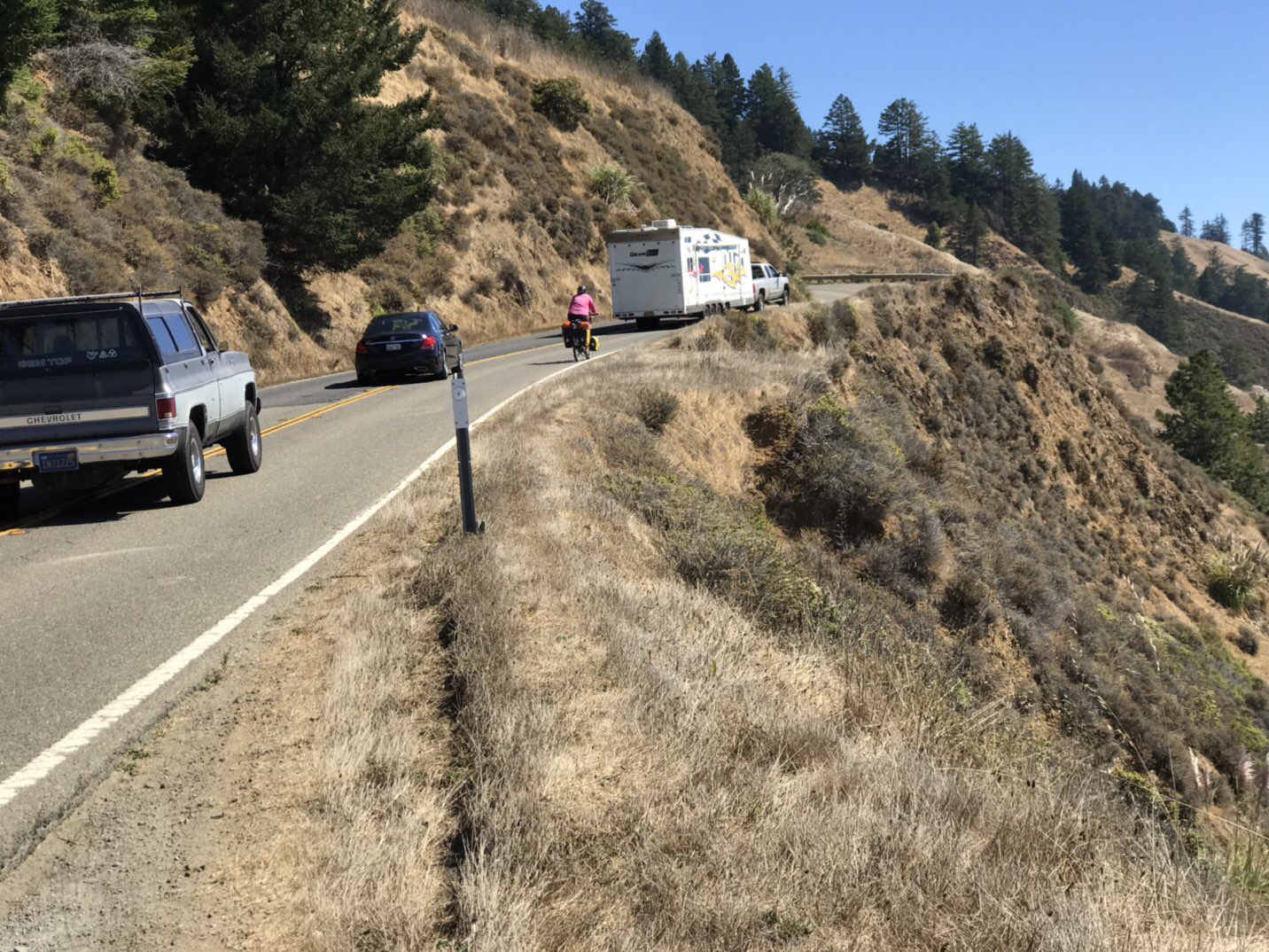 Now the road is right on the cliff edge, less than a shoulder, we can’t even ride on the white line, it’s half missing. We are also on a long, windy climb, over about six kilometres. Cars, RV’s, motorbikes, vroom, vroom, vroom, one after the other. Waiting behind us, trying not to pressure us up the hill, but we feel pressure. Every pullout, we drop off into, to let the long line of traffic go. It is exhausting and stressful. It is really difficult to appreciate the amazing coastal views in this situation. Not to mention, we are stopping so much, it feels like we’ll never get there.