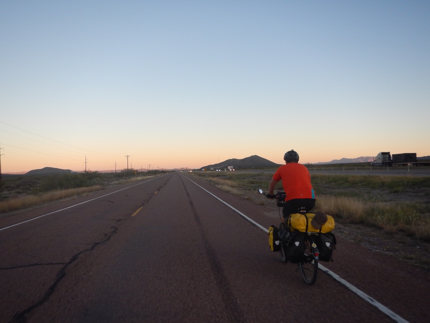 Both of us had a pretty good sleep, and the truck stop didn’t keep us up at all. We got up and going fairly early, making a quick stop at the grocery store for lunch supplies. It was a nice cool morning, and we rolled back into town, then back onto highway 20. Nice flat, quiet roads today, with not much between us and Sierra Blanca. We had a very slight tailwind too.