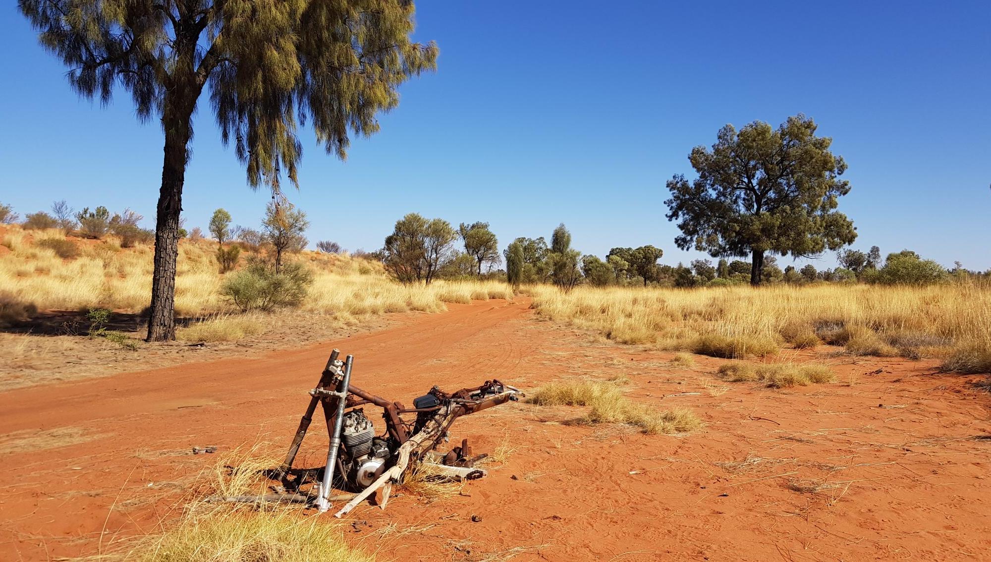 Max is feeling a bit low, and has lost his mojo. So we are all in the Pussy wagon, and driving. As it turns out, that was a great decision, as the majority of the morning was just like driving through a giant sand pit. Over dunes, on dunes, along the bottom of dunes. Sand, sand and sand. Quite outstanding for photos and drone footage, with the deep red sand, black, burnt trees, and big blue sky. It would have been an bloody tough day for Max, and we wouldn’t have made it past Well 37.