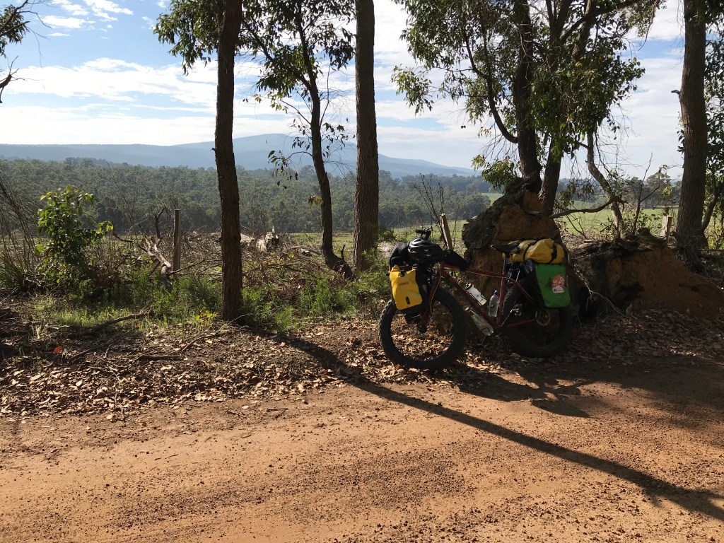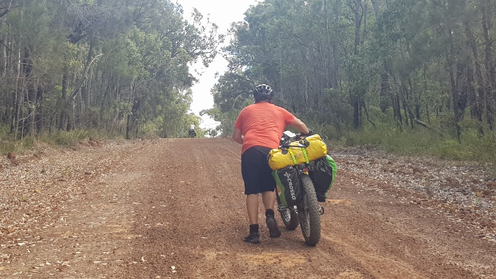 Just to drain us even more, next came the sandy hills, and even the downhills were taxing, as they were soft and rutted. Julie is much more cautious on the downhills than the rest of us, and tends to power up the hills better. But this afternoon, after 3 days of hills, she was feeling it like Will and I. She lost her focus in a patch of sand, and had a slow off. Front wheel turned, and her trusty steed threw her onto her bum in the soft sand. Not what you need at the end of a tough few days. Oh, and did I mention she has been carrying my tent for me, to help ease my weight? Bloody amazing these guys. Patient, calm, relaxed, and super helpful.