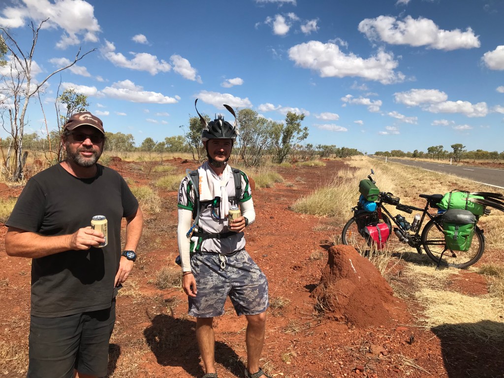 Iām feeling weary from this mosquito borne virus, most likely Barmah but I need to get a blood test to be certain. Maybe in Mount Isa ? Jenny did 90% of the driving today while I rested. We did stop at Burke and Wills Roadhouse for a very short time, they are obviously anti dogs there with “No Dogs” signs up at what seemed like every 3 metres. A little further on we come across Gernot from Germany a young bloke in his late 20’s who is cycling from Melbourne to Darwin via Tasmania during a pandemic. He arrived into Australia in 2019 and so far has ridden 13000kms. We shout him a beer as we donāt have any other cold drinks in our fridge.