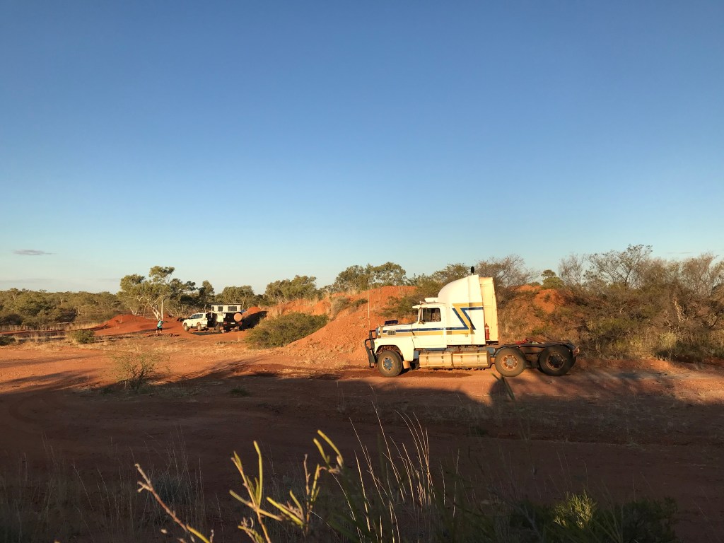 Come 3.30pm we have done 320kms, there is a gravel pit marked on WikiCamps about 2kms off the main road along Kajabiddi Road. We check it out. We find itās a neat little Gravel Pit with a dead prime mover truck parked up in it. Someone has left fire wood behind for us, it turns into a glorious night, with a finger nail Moon and Venus hanging in the north western sky together. After hotdogs for dinner weāre off to bed by 9pm.