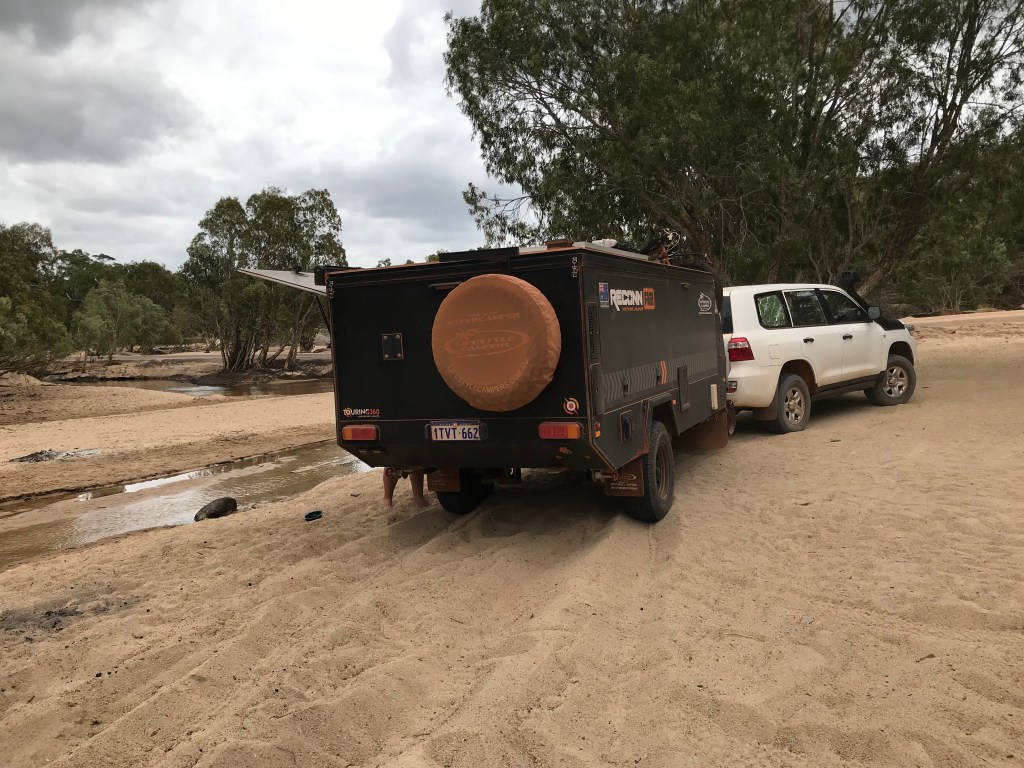 Itās a relatively easy drive down to Archer River with a final 20km section of bitumen. When we arrived at Archer River there was only one other vehicle set up in there. We decided to stop for lunch, I carefully drove off the concrete floodway ledge onto the sand, I went to do a U turn to place the car and camper into a position where we had a view of the river and exiting would be easier. Then the next thing you know Iām bogged, I nearly managed to get out with low range 4WD and crawl control but the Dunlop highway terrain tyres were to hard to gain any significant traction.