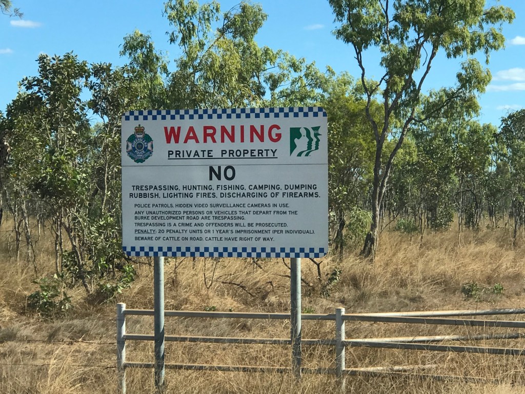 Not long after the river crossing you get onto the Burke Development Road. Rougher more corrugated dirt with bull dust holes, lots more traffic and some very large road trains carting road base. Itās all cattle country out here and the pastrolists donāt like tourists or travellers judging by the serious looking warning signs. Finding a camp site proves problematic, as the late afternoon wears on I have one near miss with a large wallaby or small kangaroo. Both Jenny and I are tired and worried.