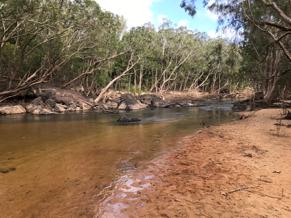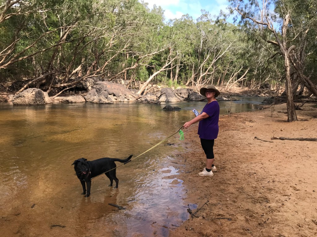 By the time we finished lunch itās after 2pm, Rodgie enjoyed herself swimming in the river and playing with some kids from Dunsborough WA who are on a year tour and other kids from a second caravan from Newcastle NSW. After more chitter chatter with people who informed us that no dogs are allowed at the Coen Caravan Park I make the call and decided we will just spend the night here. There ended up being us and 4 other camping outfits ranging from 18yo Isaac and his girlfriend in their old Nissan Xtrail with a tent, Anton and Jo around our age with an ARB rooftop tent on a Mazda BT50 and the two young families with there large caravans.