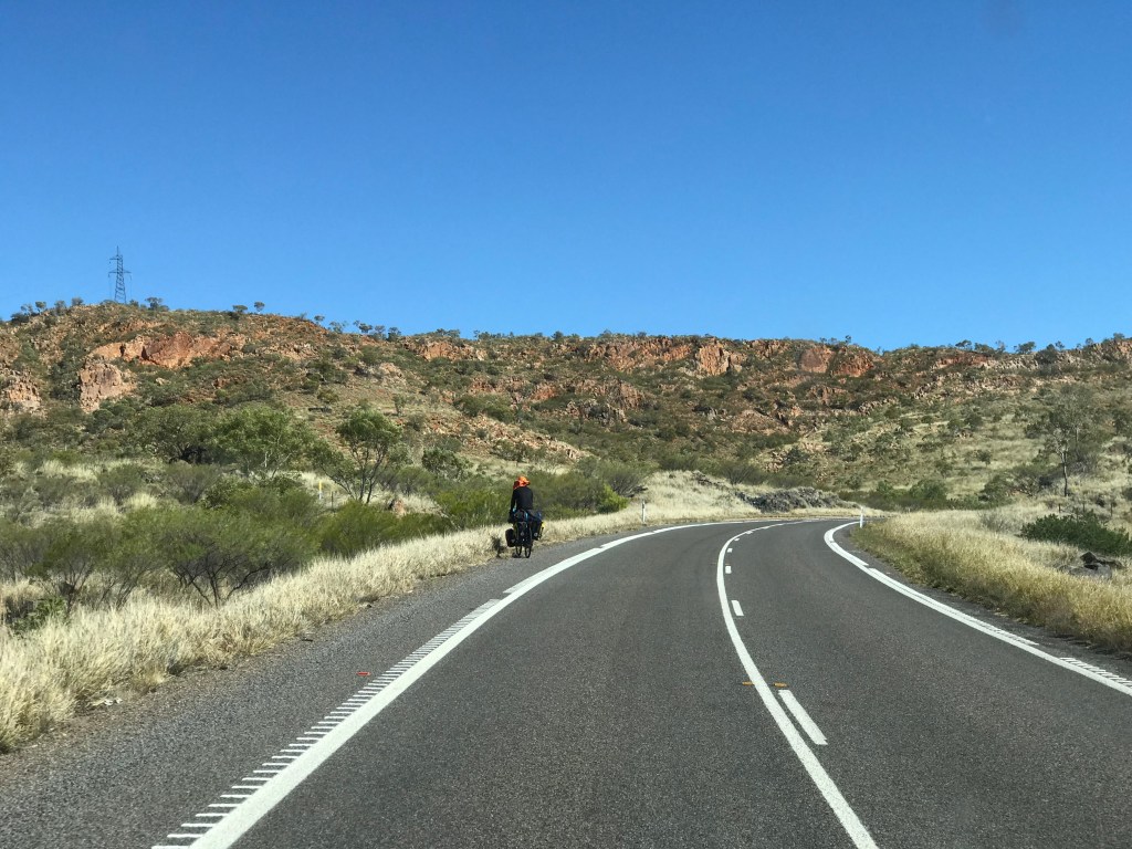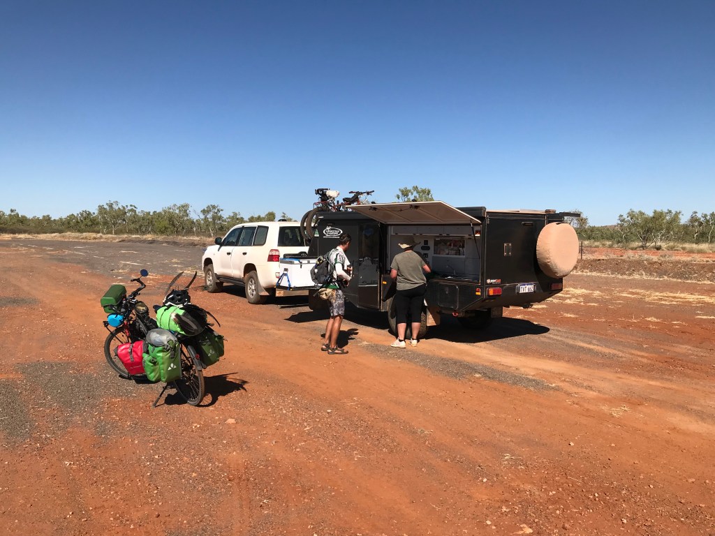 Not a very eventful day, on the road at 10am, after 15kms we past a cyclist who we first noticed back at the Burke and Wills “we don’t like dogs here” Roadhouse. There wasn’t anywhere safe or convenient to pull over so we continued on. Then at the 20km mark we once again passed German Cyclist “Gernot” (he does have an Instagram account “Gernotbybike” if you’re curious). About a kilometre along there was a safe spot to pull up on the right side of the highway and wait for him.