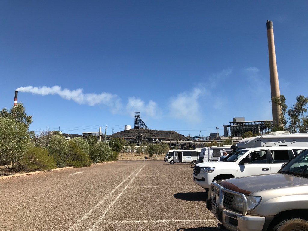 Next stop fuel from the Shell truck stop at 149.9cpl. Vehicle economy worked out to be 16 litres per 100kms. Then back to the RV dump point to empty our toilet which I did while Jenny did some online work. We also topped up our water tanks. Both services are free and provided by the Mount Isa City Council. The Dump point is in the shadow of the Lead Mine, smoke stack and Processing Plant.