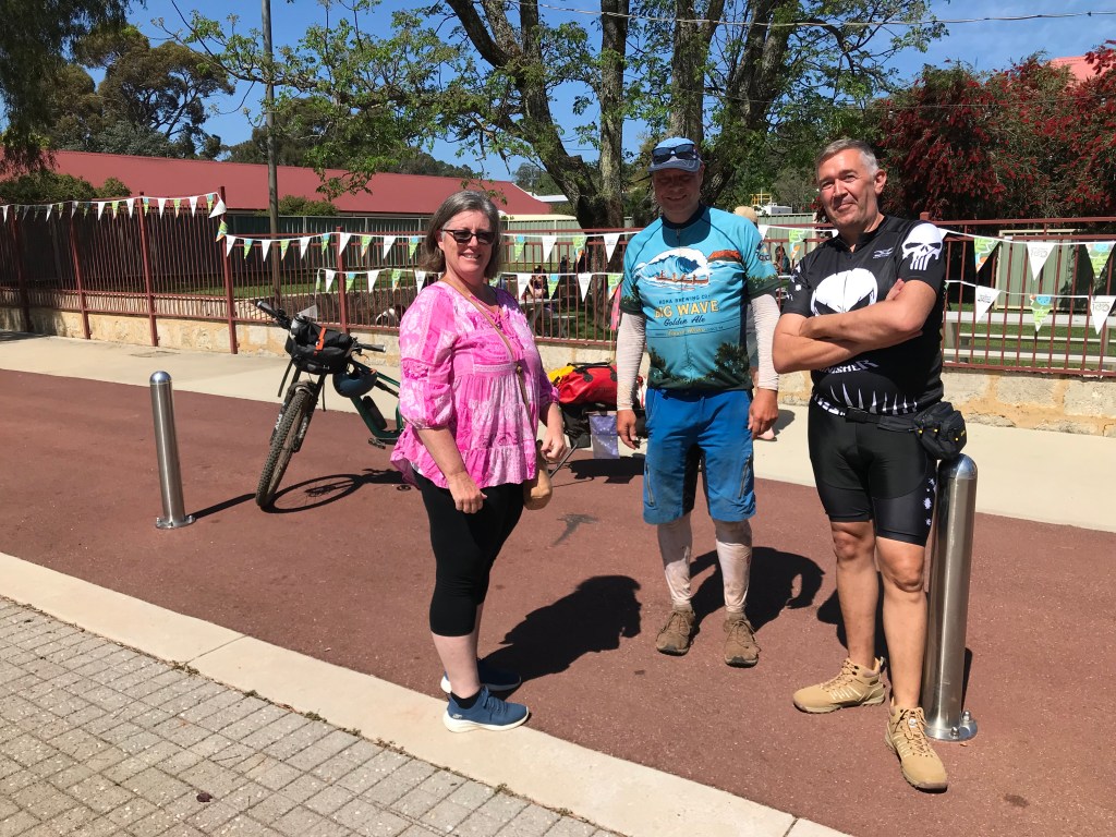 Jenny Carsten and Peter at the Dwellingup Hotel. Carsten started his Munda Biddi ride at Mundaring 2 days earlier. Peter was sick so stayed with us and we drove to Dwellingup.